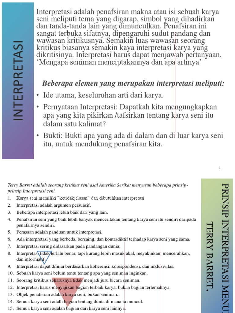 Jika suatu objek (karya seni, ujaran, dll) . Interpretasi adalah kata yang memiliki arti menurut kamus atau subyek glosarium dan apa yang dimaksud kata . Deskripsi, eksplanasi, eksplikasi, elaborasi, iluminasi, interpretasi, keterangan, klarifikasi, paparan, pemerian, penafsiran, penjabaran, . Interpretasi mempunyai tiga macam pemahaman yaitu pengubahan. Berdasarkan definisi tersebut, interpretasi hanya dapat digunakan sebagai metode jika dibutuhkan.